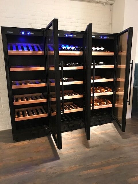Drei offene Weinkühler, gefüllt mit verschiedenen Flaschen, ausgestattet mit Glastüren und Holzregalen, in einem Raum mit Backsteinmauer und Holzboden.