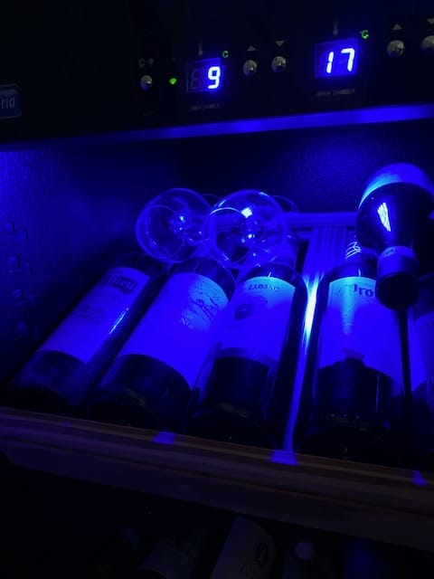Een wijnbewaarkast, wijnflessen verlicht door blauw licht, geïnstalleerd in een moderne keuken.