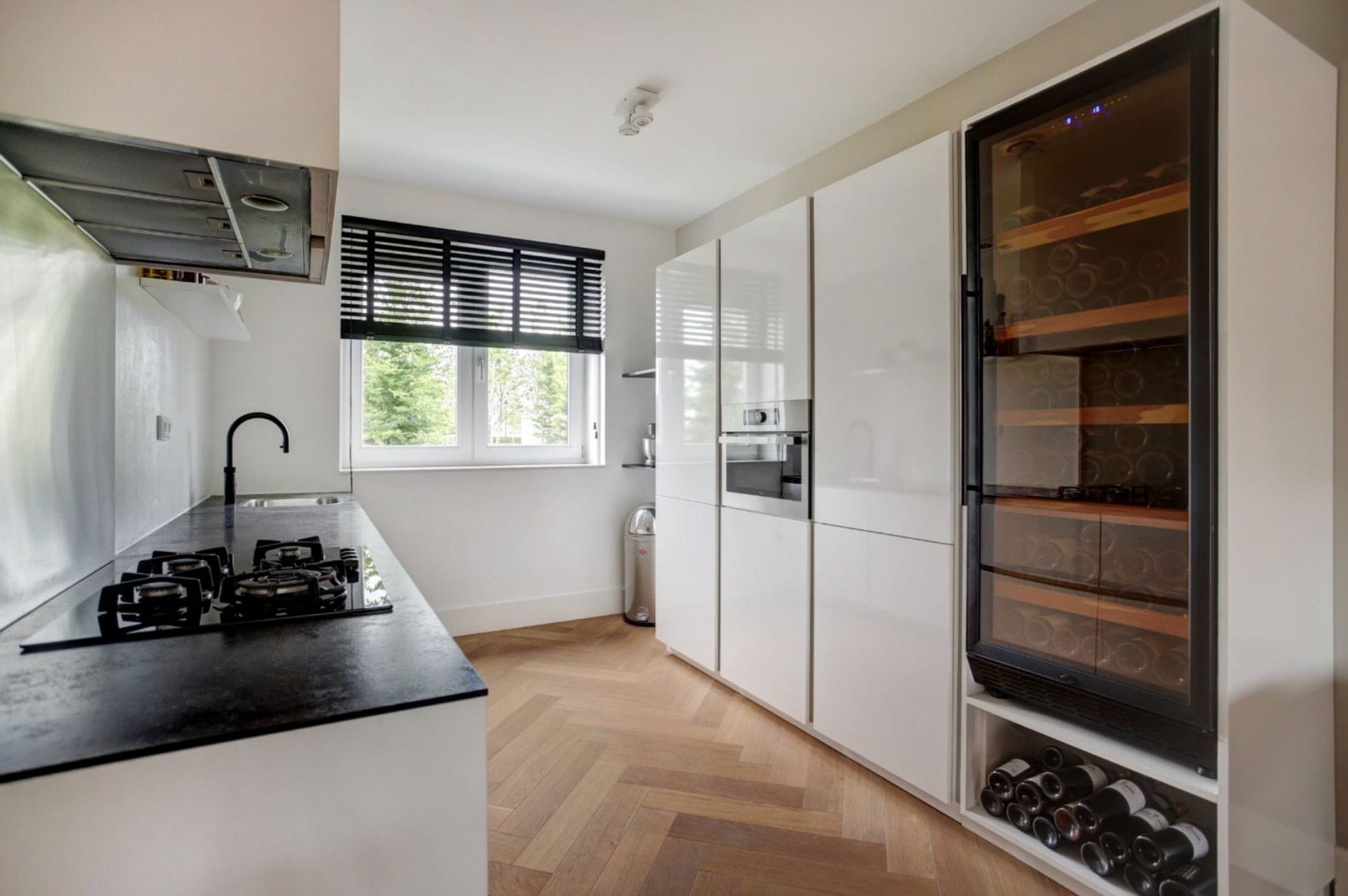 Moderne Kücheneinrichtung mit weißen Schränken, einem Gasherd, einem eingebauten Weinkühler (120 Flaschen, mehrere Zonen, 164 cm Höhe) und Blick auf ein Fenster.