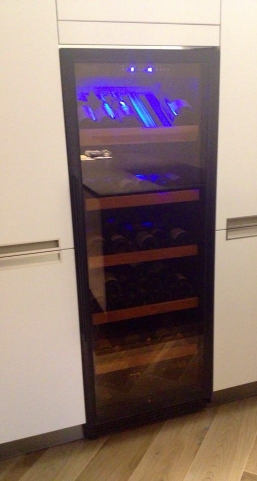 Ein eingebauter Weinkühler (120 Flaschen, mehrere Zonen, 164 cm Höhe) mit Glastür, ausgestattet mit beleuchteten Innenregalen, die teilweise mit Weinflaschen gefüllt sind, platziert in einem modernen Küchenschrank.