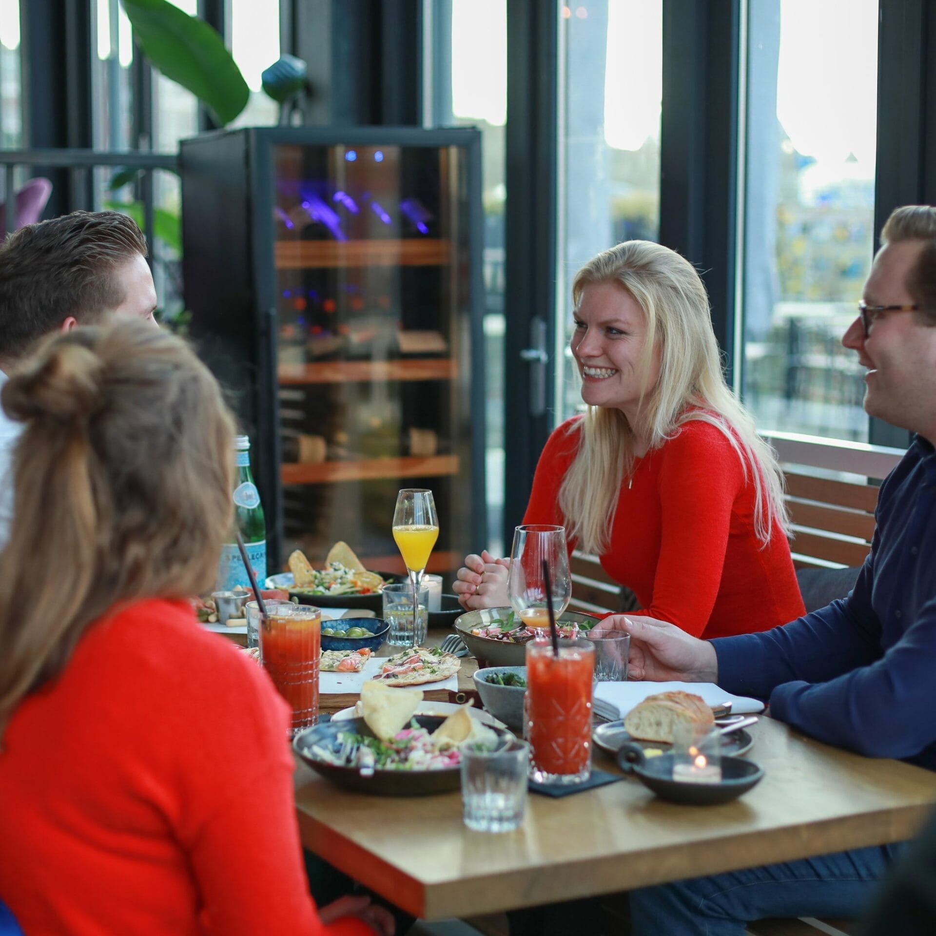 Zwei Paare genießen eine Mahlzeit an einem Restauranttisch, reden und lachen bei Getränken und verschiedenen Gerichten auf dem Tisch, darunter der Weinklimaschrank (120 Flaschen, mehrere Zonen, 164 cm Höhe).