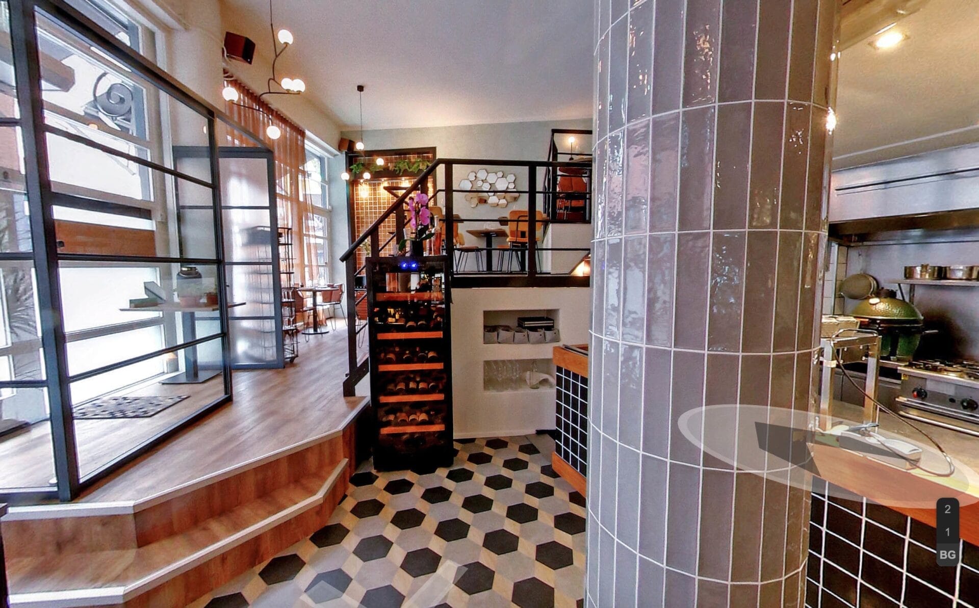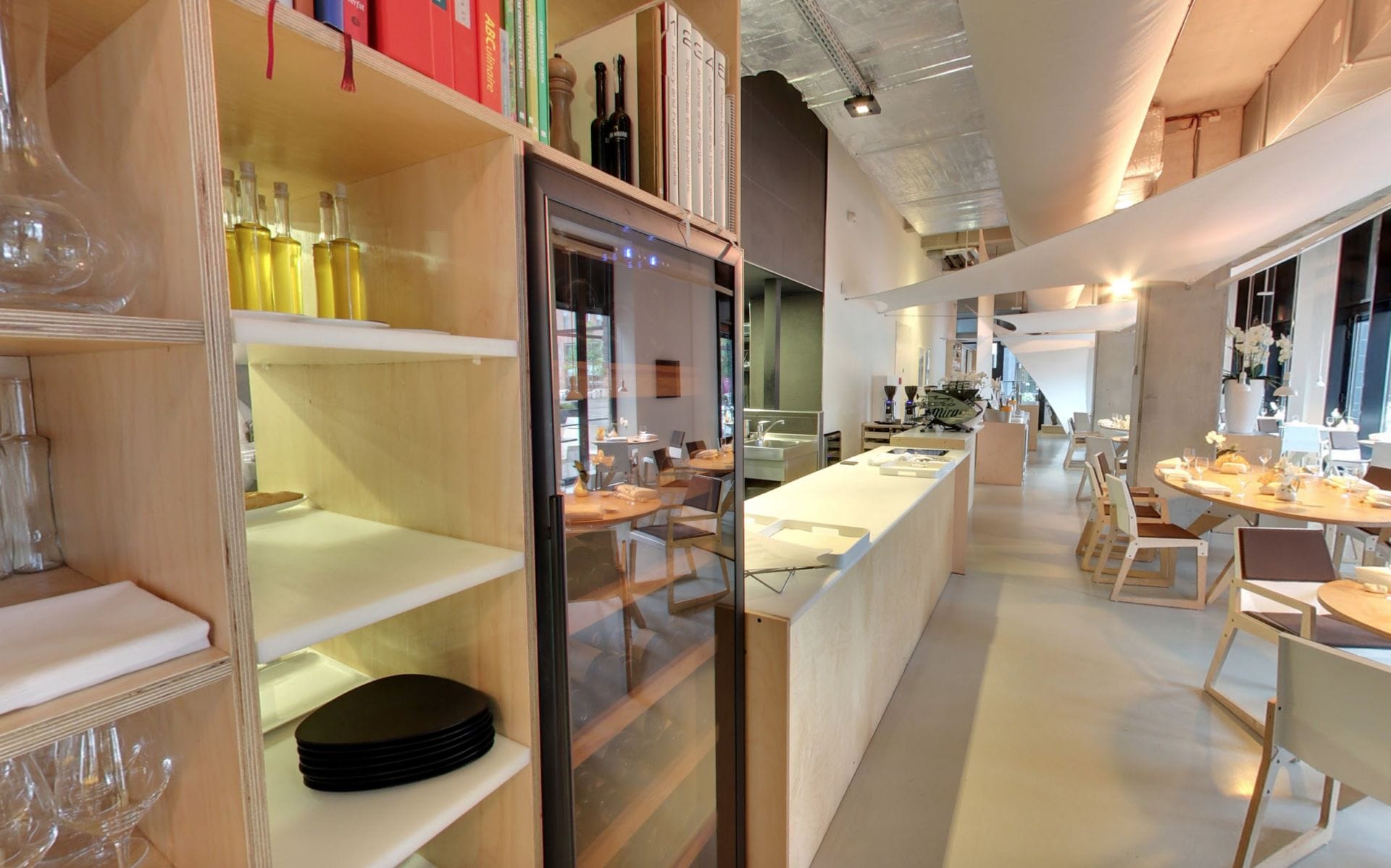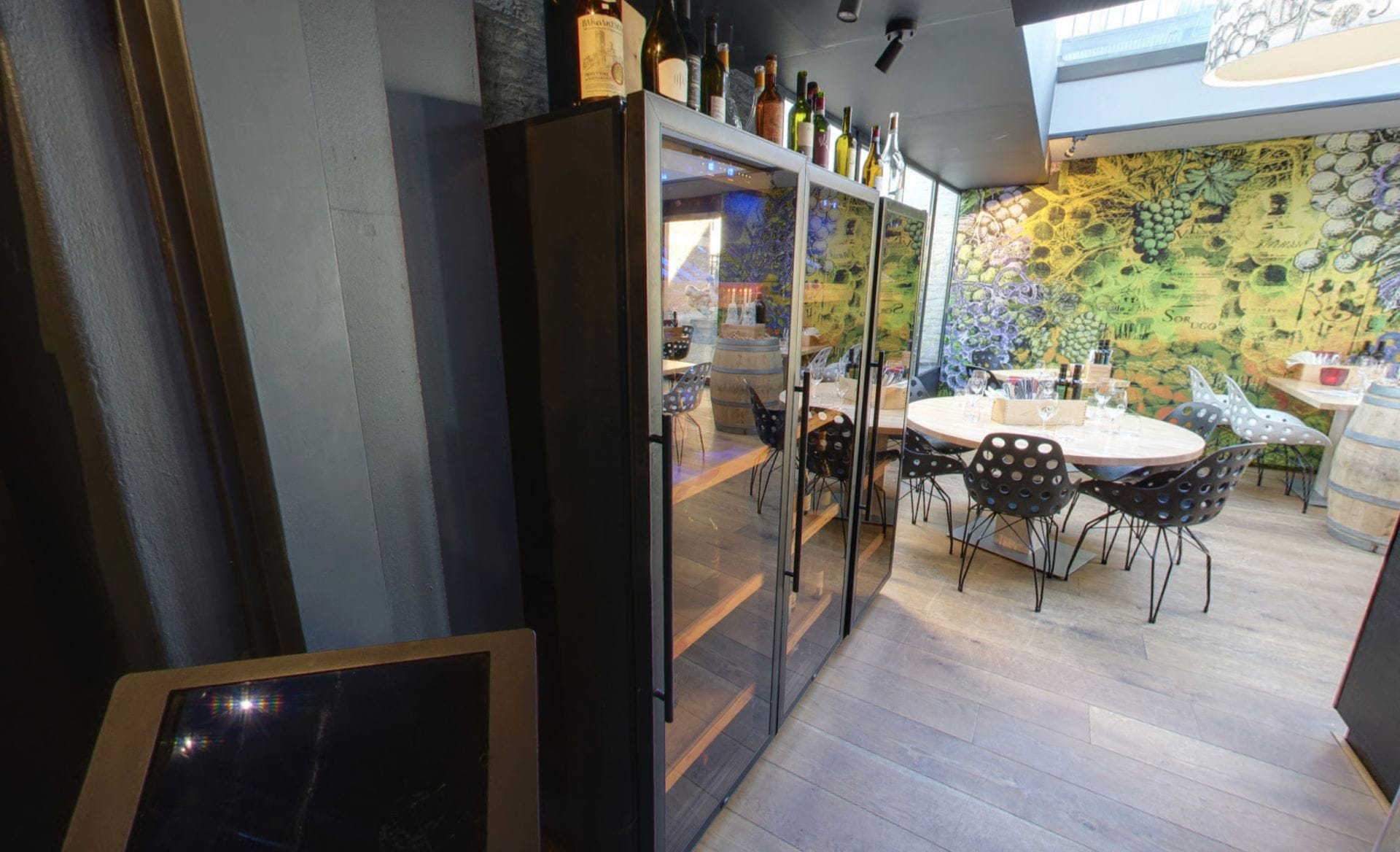 Innenraum eines modernen Restaurants mit Holzregalen gefüllt mit Weinkühlern (120 Flaschen, mehrere Zonen, 164 cm Höhe) und gedeckten Tischen.