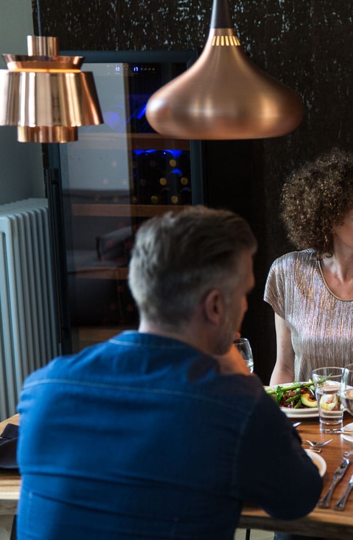 Zwei Menschen essen in einem Restaurant, im Mittelpunkt steht ein Mann von hinten, ihm gegenüber sitzt eine Frau, beide sitzen an einem Tisch mit Speisen und Getränken, während sie neben ihrem Weinklimaschrank (120 Flaschen, Mehrzonen, 164 cm Höhe) stehen.