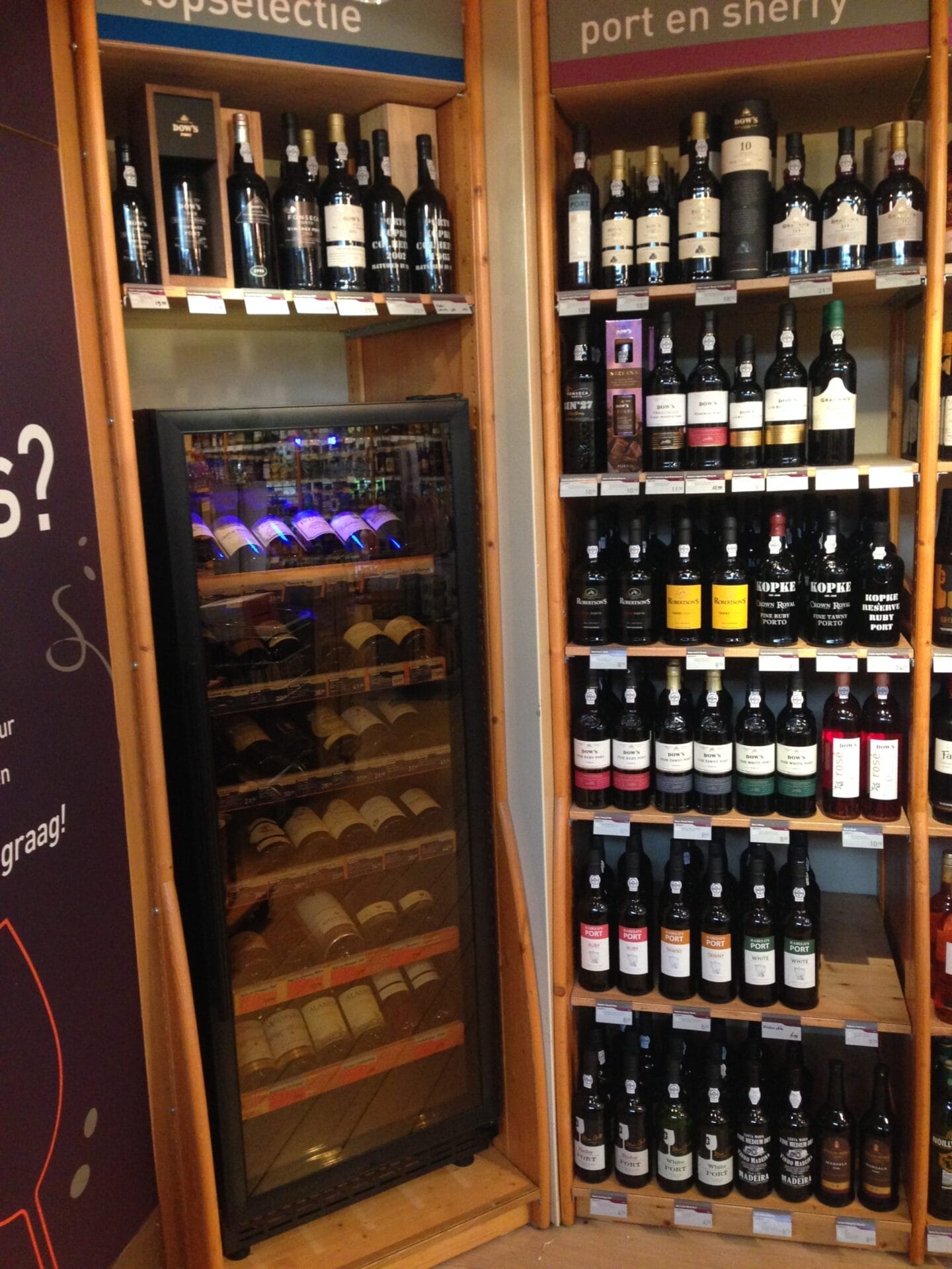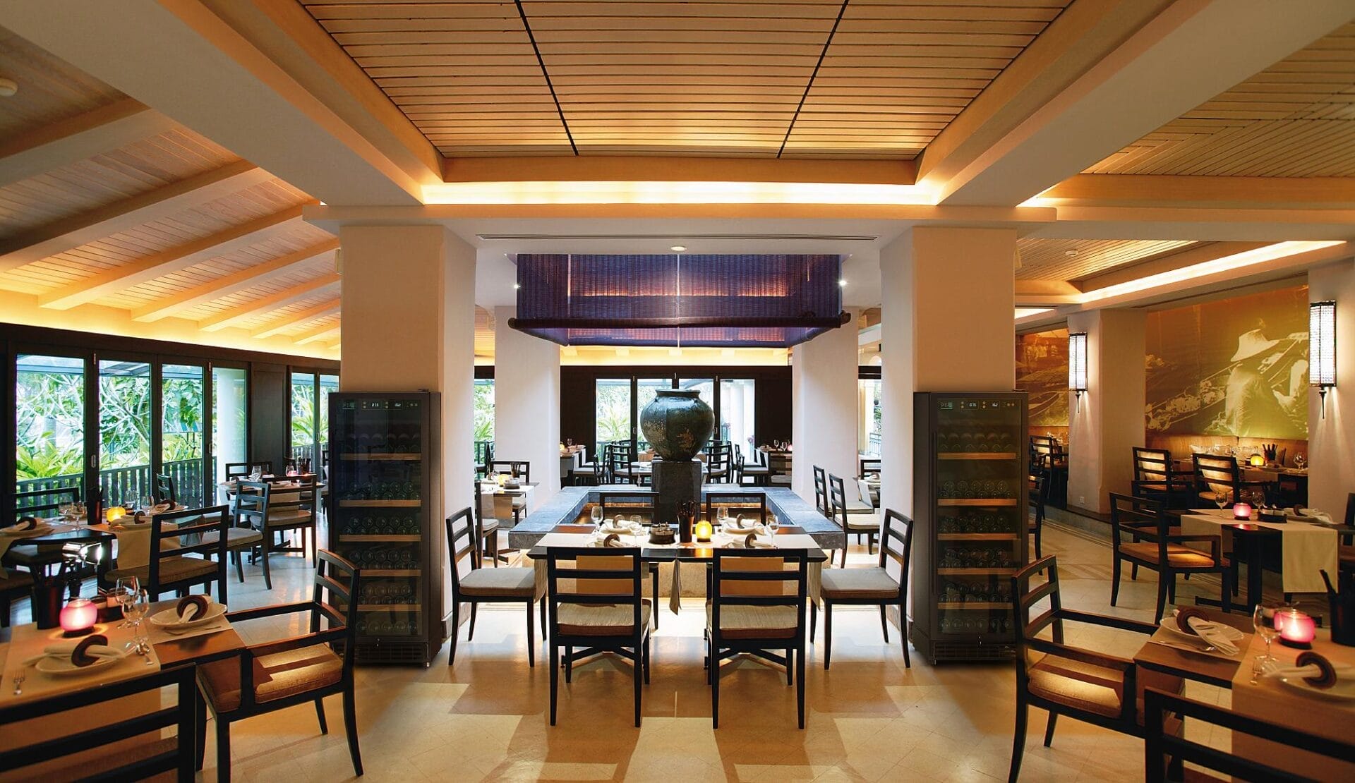 Elegante restaurant in een luxe hotel, met gedekte tafels voor een maaltijd, allemaal gecentreerd rond de bewaarkast (max. 120 flessen, 164 cm hoogte).