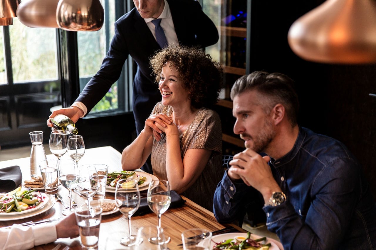 Eine Frau und ein Mann speisen in einem Restaurant und lächeln, während ein Kellner Essen serviert, während ihr Weinklimaschrank (120 Flaschen, Mehrzonen, 164 cm Höhe) in der Nähe steht.