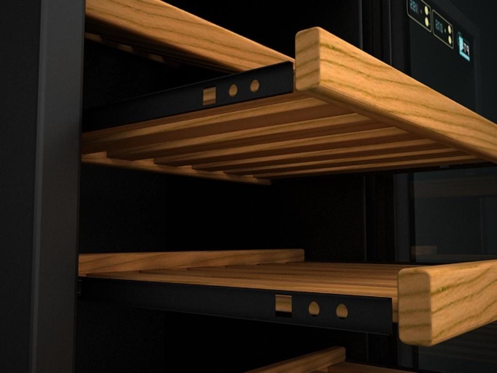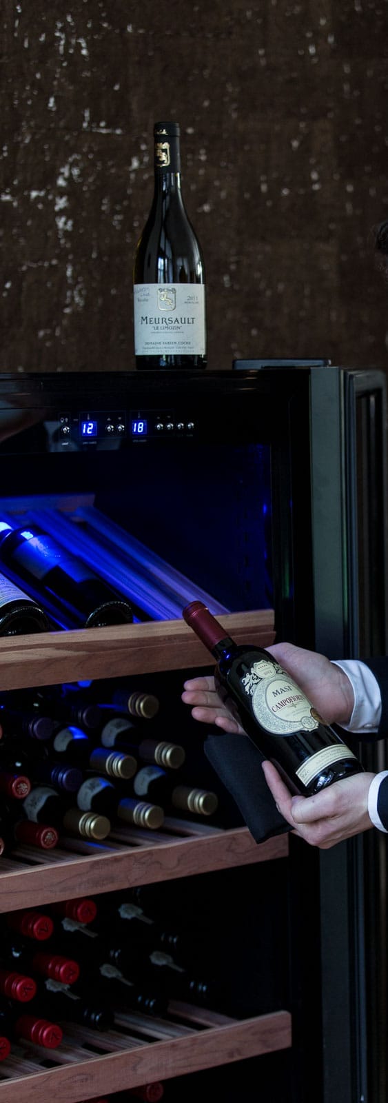 Persoon die een wijnfles selecteert uit een Wijnklimaatkast met het bovenste plateaus voorzien van een schuin opslagplateau.