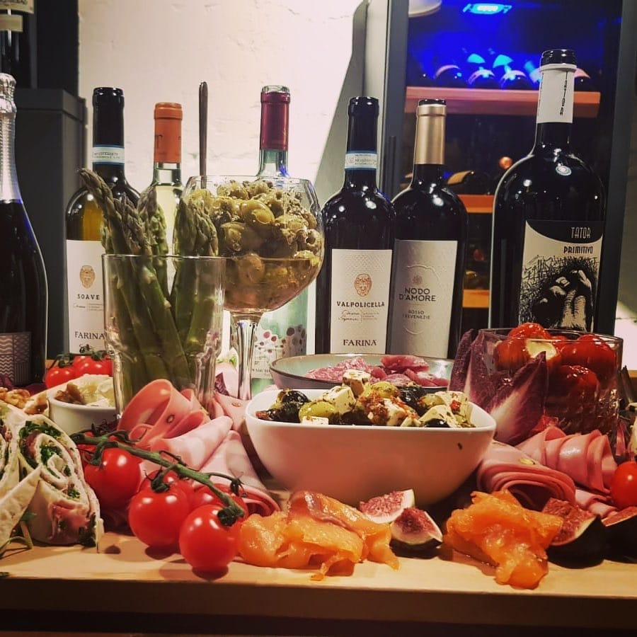 Eine Auswahl an Gourmetgerichten, darunter Aufschnitt, Käse und Oliven, umgeben von verschiedenen Weinkühlerflaschen (120 Flaschen, mehrere Zonen, 164 cm Höhe), auf einem Tisch.