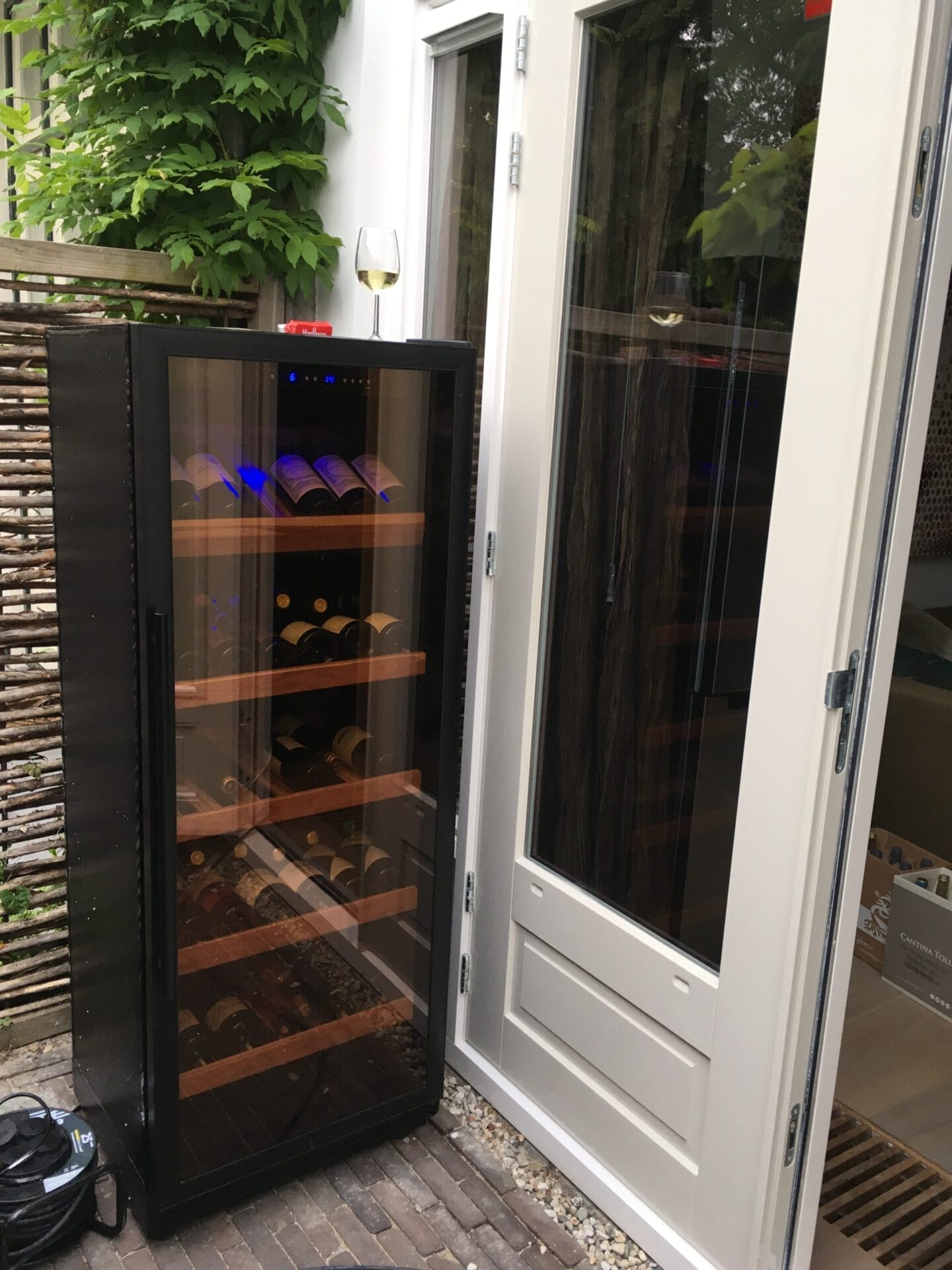 Een bierbewaarkast (275 liter) met glazen deur en houten plateau, geplaatst op een overdekt terras.