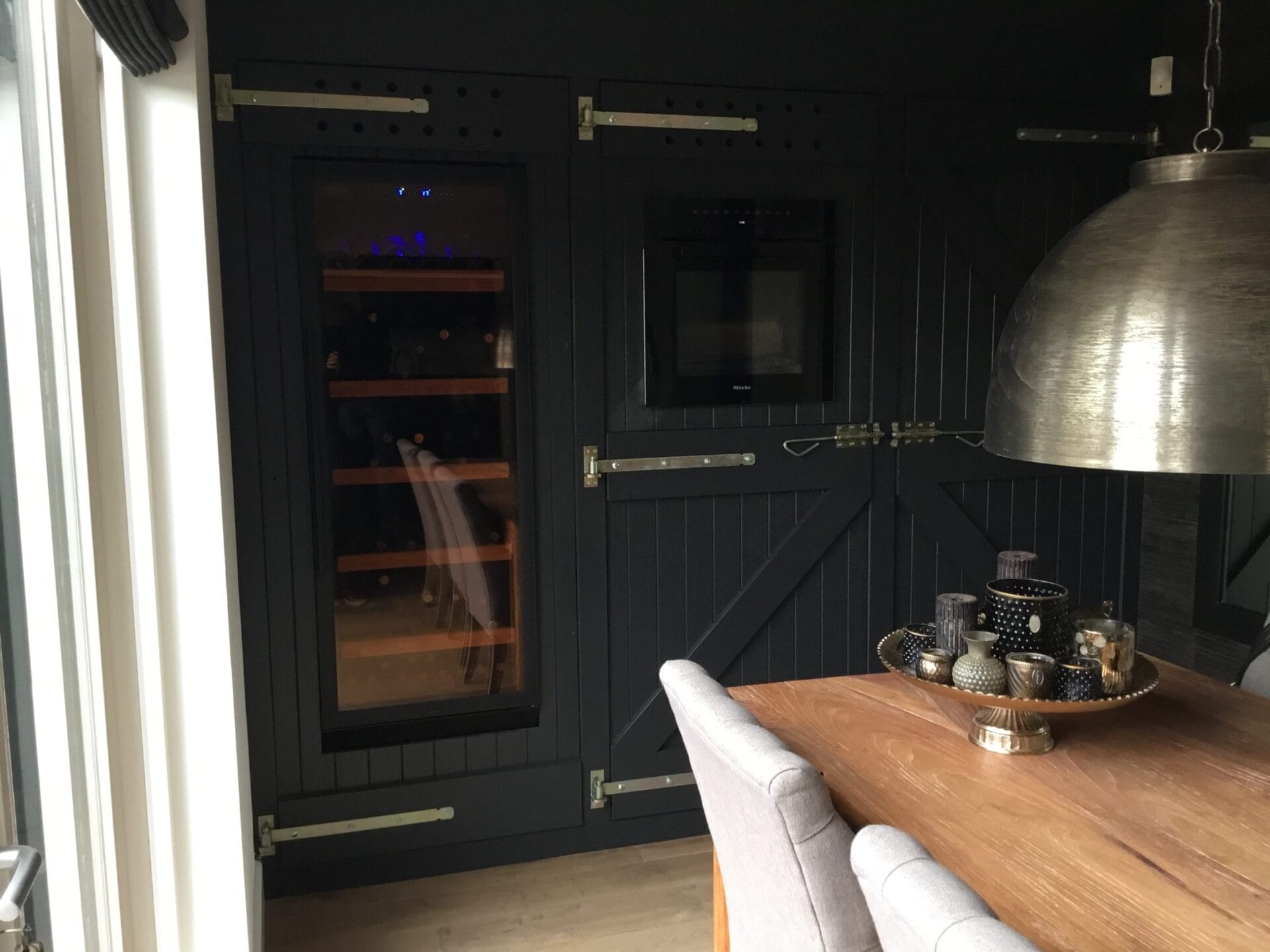 Kamer, voorzien van een Wijnbewaartkast (max 120 flessen, 164 cm hoogte) met glazen deuren, een houten tafel, metaalkleurige hanglamp en een grijs gestoffeerde stoel.