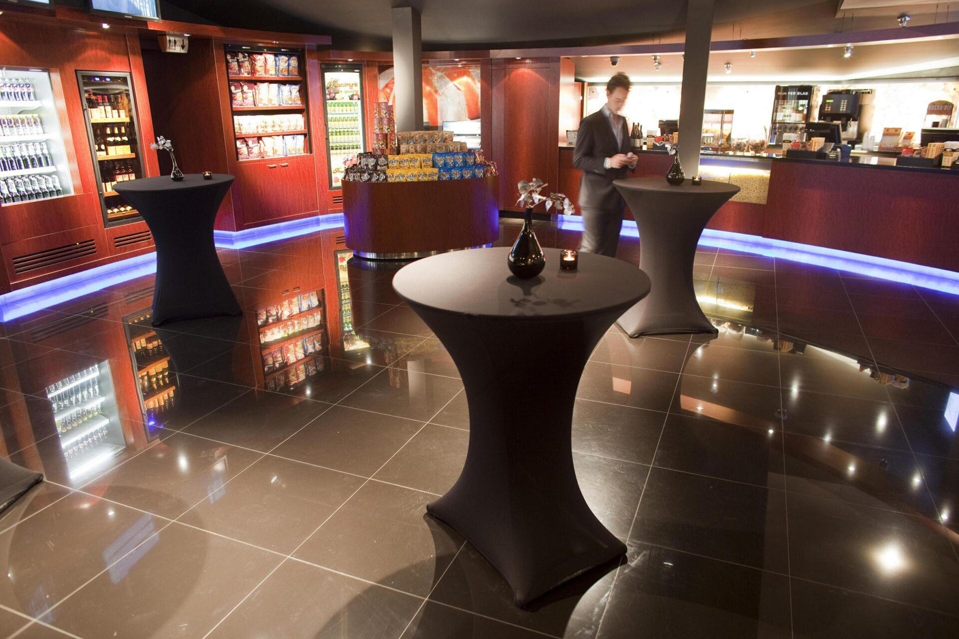 Modern barinterieur in een bioscoop, met een ingebouwde bewaarkast op de achtergrond.