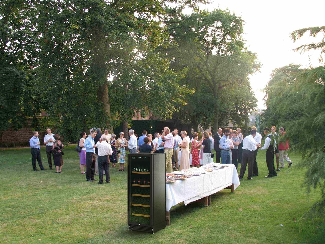 Eine Gruppe von Menschen vergnügt sich gemeinsam auf einer Gartenparty an einem Tisch mit Erfrischungen und einem tragbaren Weinkühler (120 Flaschen, mehrere Zonen, 164 cm Höhe).