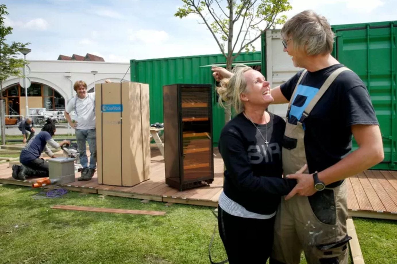 Eine Frau richtet in einem Park spielerisch die Haare eines Mannes aus, während andere Männer Möbel um grüne Schiffscontainer herum zusammenbauen.