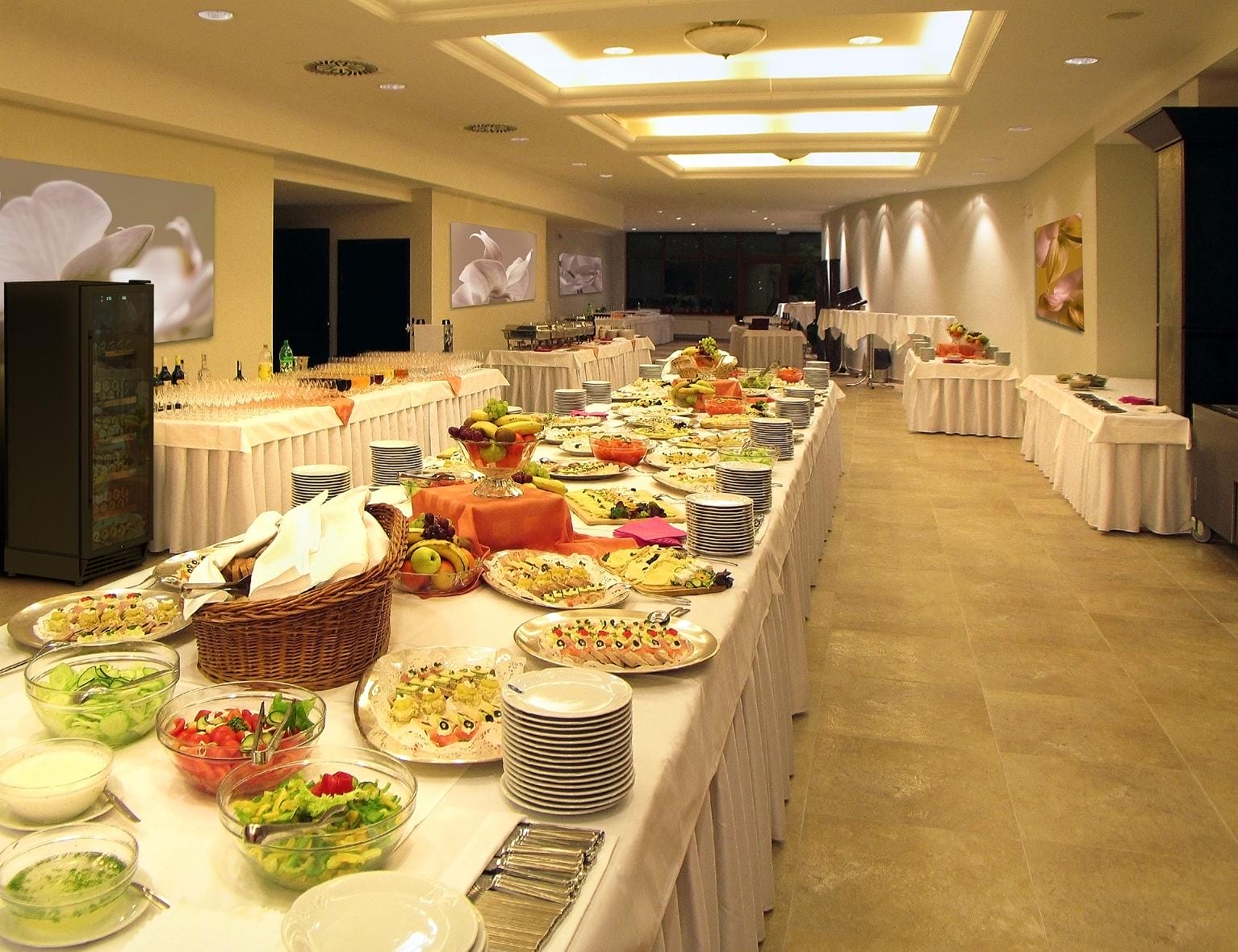 Geräumiger Bankettsaal mit einem Buffet mit verschiedenen Gerichten und Salaten, einschließlich Stationen für Getränke und Desserts, dekoriert mit Blumenbildern an den Wänden.
