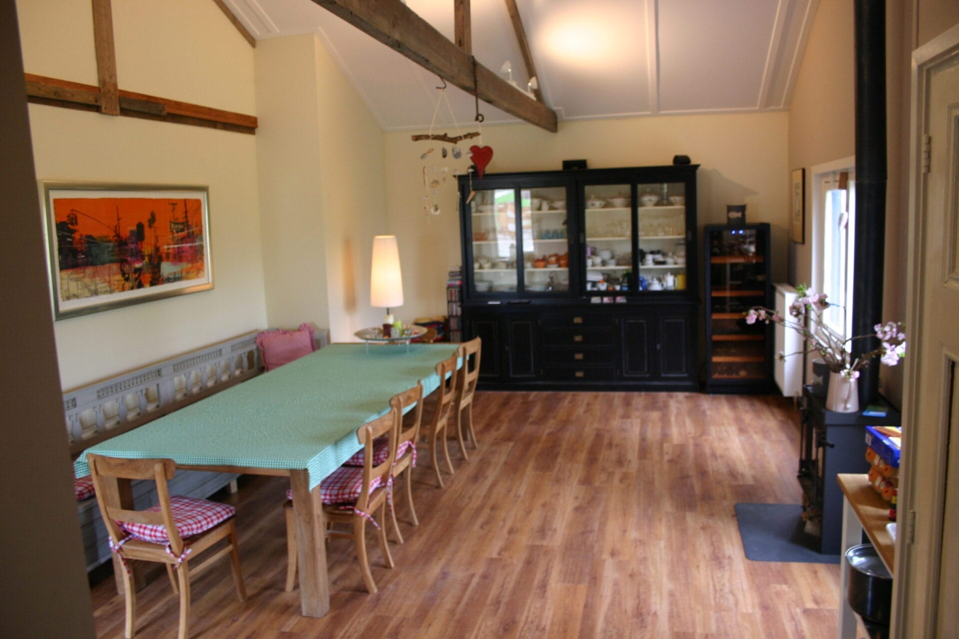 Geräumiges Esszimmer mit einem großen grünen Tisch, Holzstühlen und einem schwarzen Schrank mit freiliegenden Balken und Holzböden.