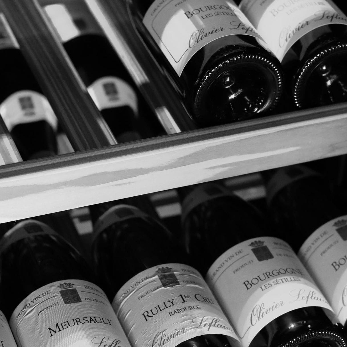 Zwart-witfoto van wijnflessen horizontaal gestapeld op houten plateaus, met zichtbare etiketten.