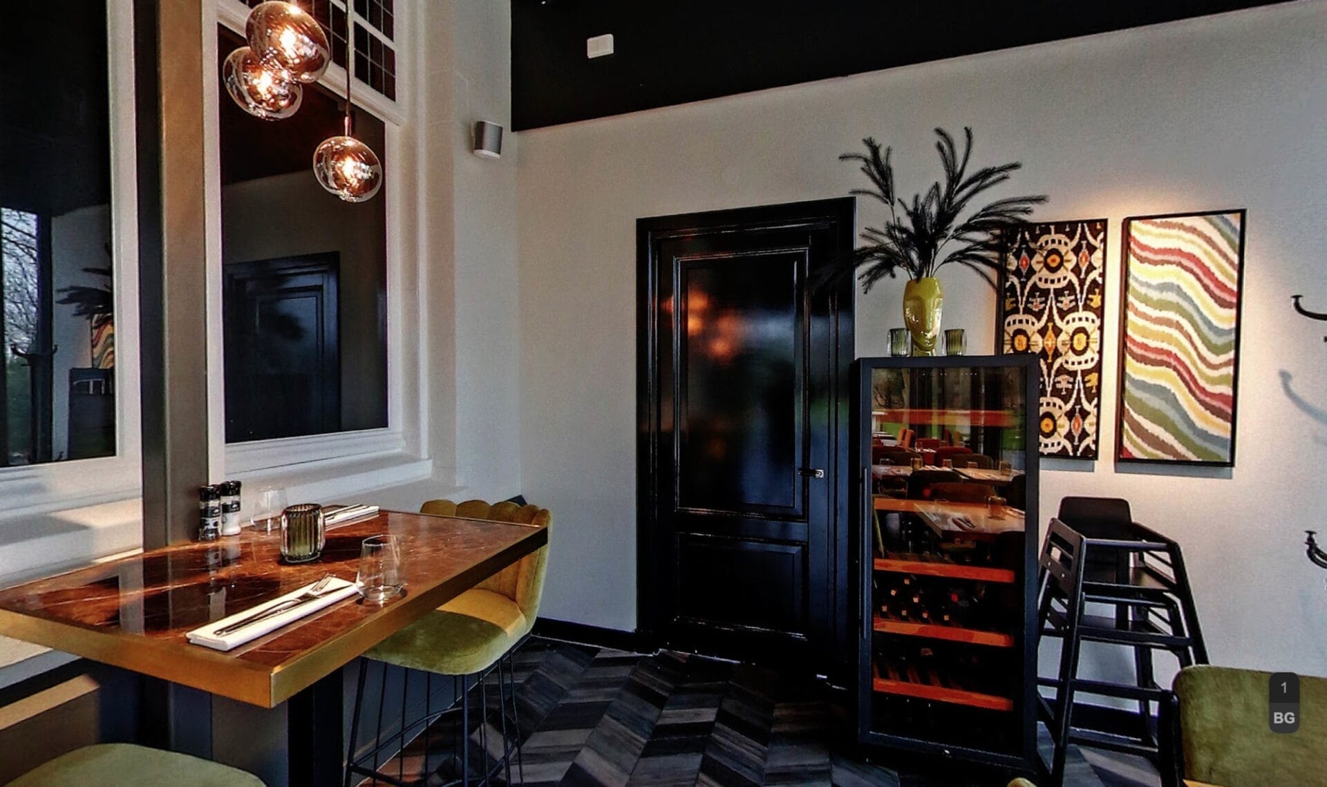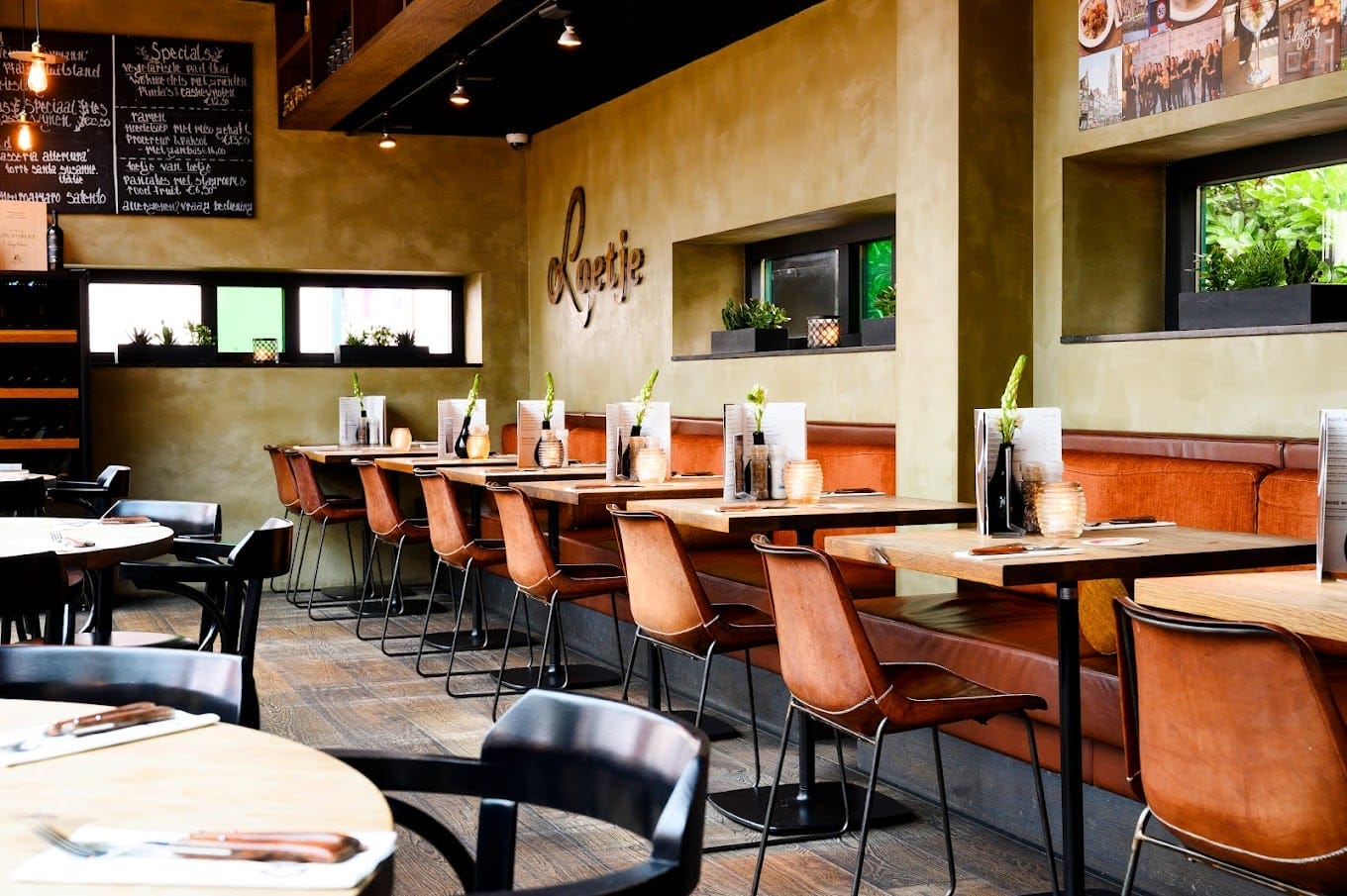 Moderne eethoek van een restaurant voorzien van een bewaarkast.