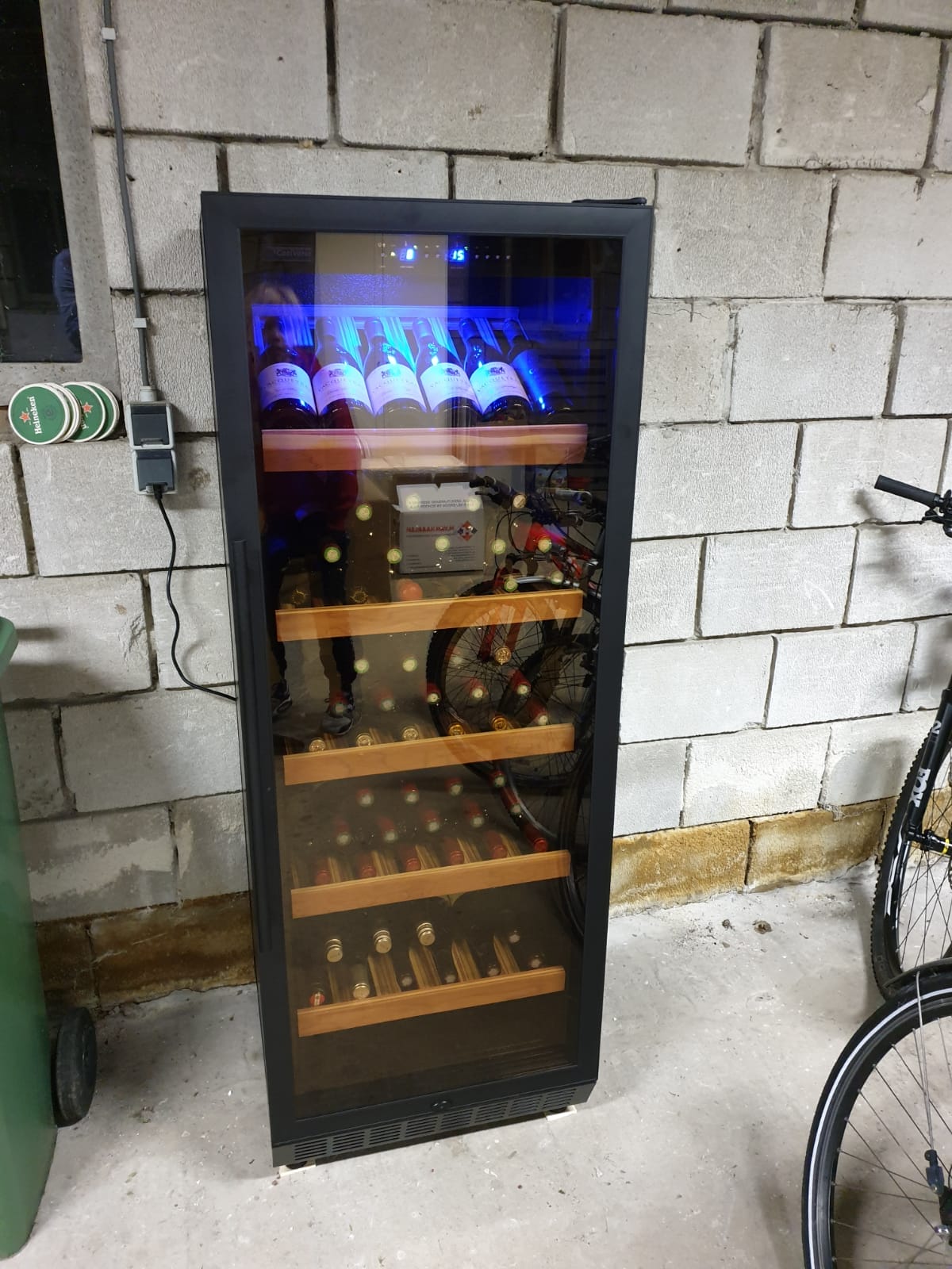 Ein Weinkühler mit Glastür, gefüllt mit Flaschen, beleuchtet von blauem Licht, steht neben einem Fahrrad in einer Garage mit einer Betonblockwand.