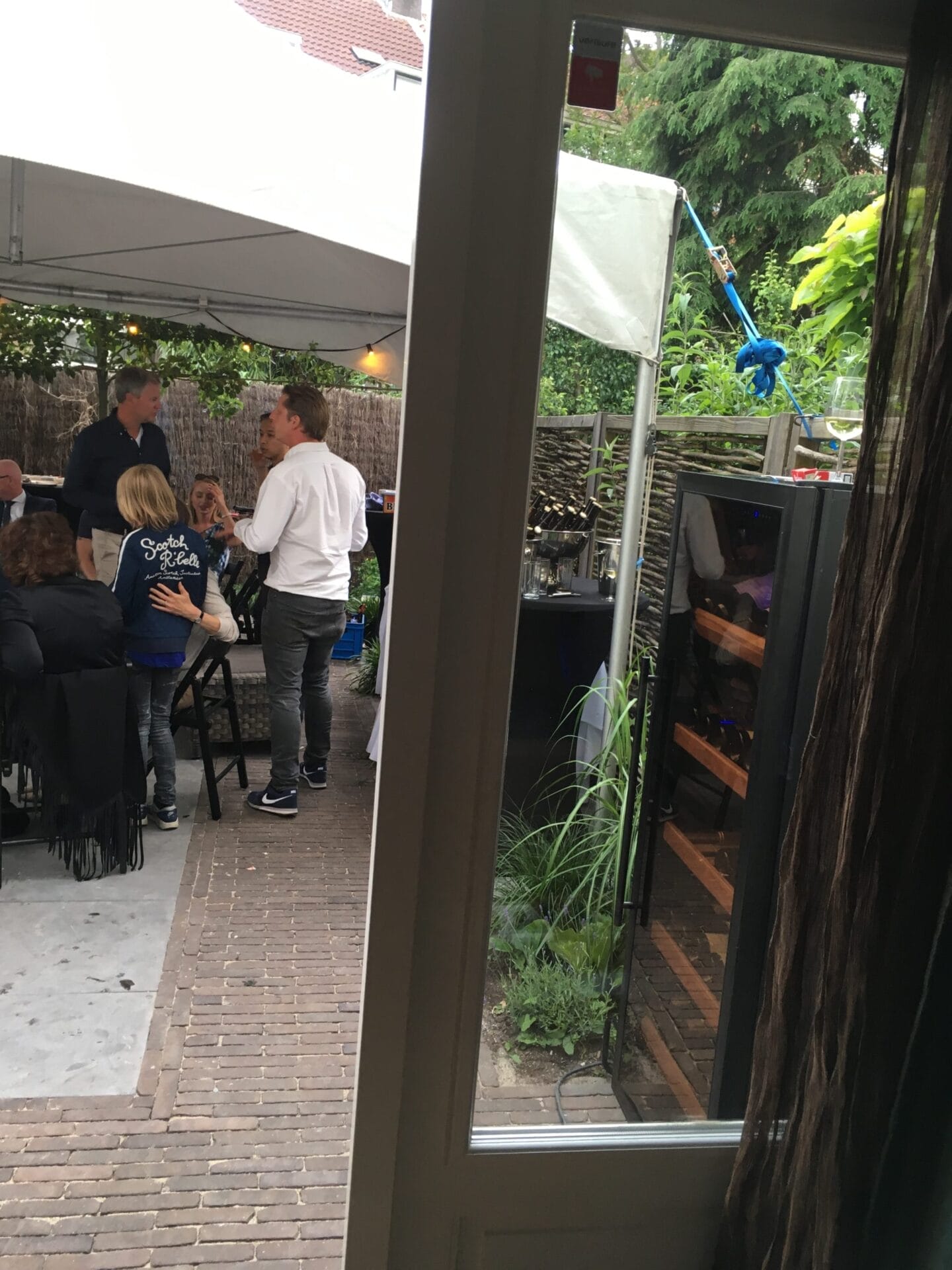 Blick von einer Tür auf Menschen, die sich unter einem Zelt in einem Hinterhof versammelt haben, während ein Mann in einem schwarzen Hemd mit einem anderen in einem weißen Hemd spricht.