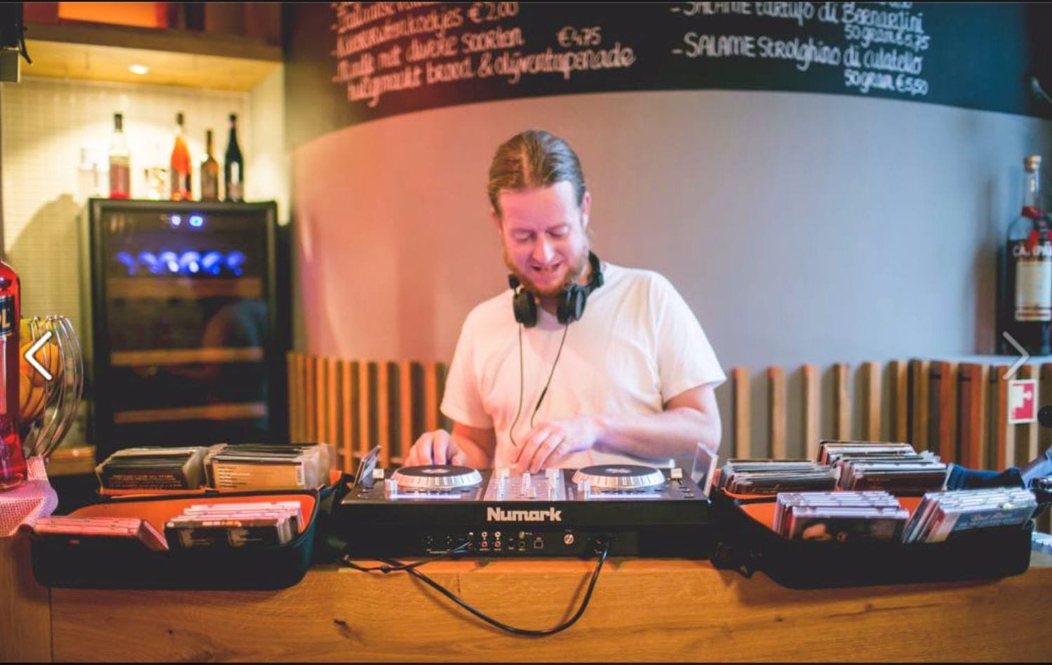 Ein DJ mischt Musik auf Plattenspielern in einer warm beleuchteten Barumgebung, umgeben von Schallplatten und einer Tafelkarte im Hintergrund.
