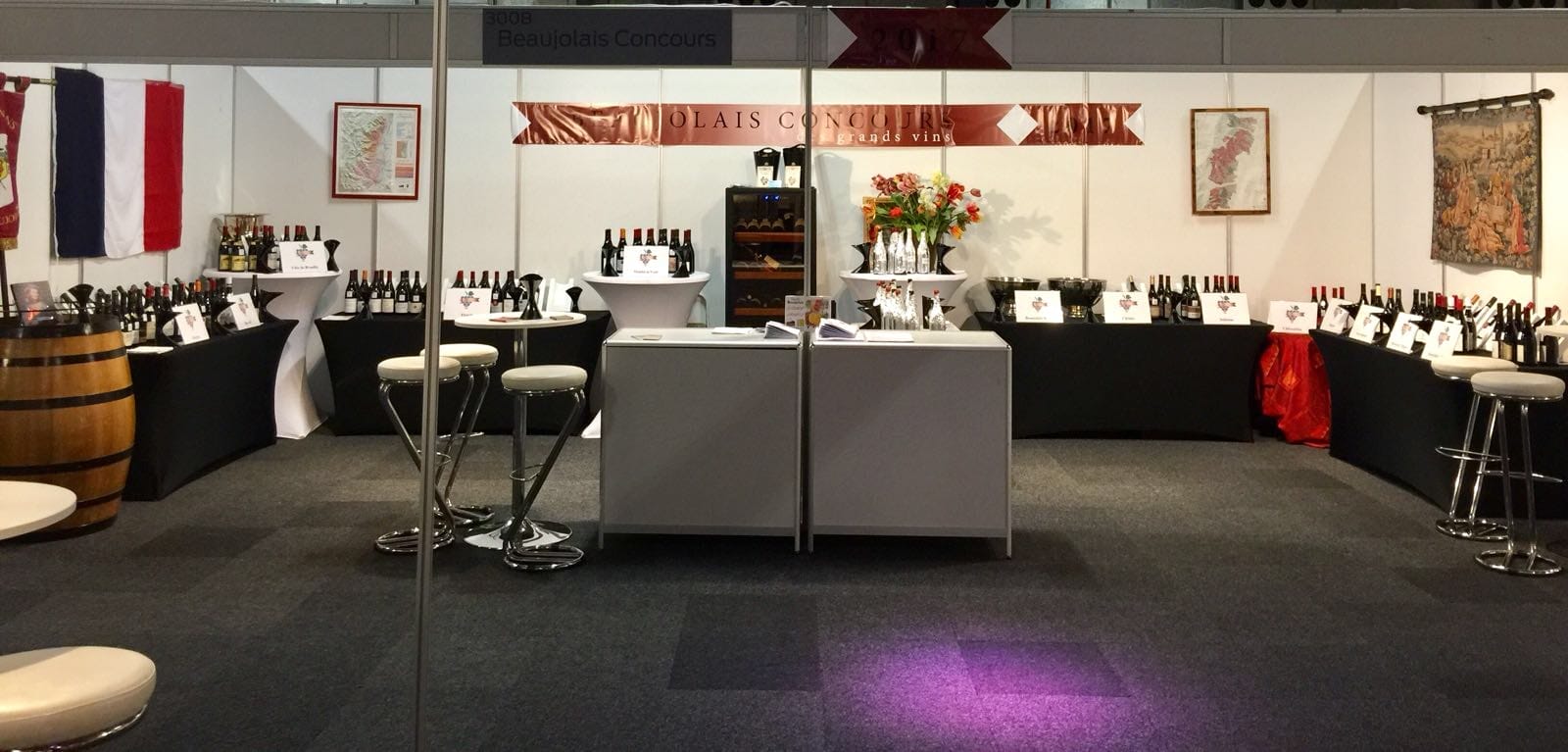 Eine Weinprobe auf einer Messe mit Flaschen auf Tischen, Hockern zum Sitzen und Bannern mit der Aufschrift „Beaujolais Concours“.