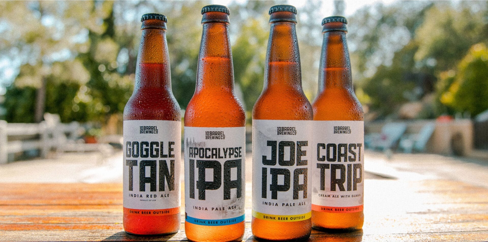 Vier Flaschen Craft-Bier mit der Aufschrift „goggle tan ipa“, „pocalypse ipa“, „joe ipa“ und „coast trip ipa“ auf einem Holztisch draußen mit verschwommenen Bäumen im Hintergrund.