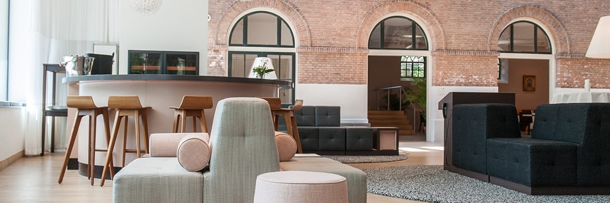 Moderner Loungebereich mit verschiedenen Sitzmöglichkeiten, darunter Barhocker und Sofas, vor Backsteinbögen und großen runden Fenstern, komplett mit einem Bierlagerschrank (450 Liter, Höhe 180 cm).
