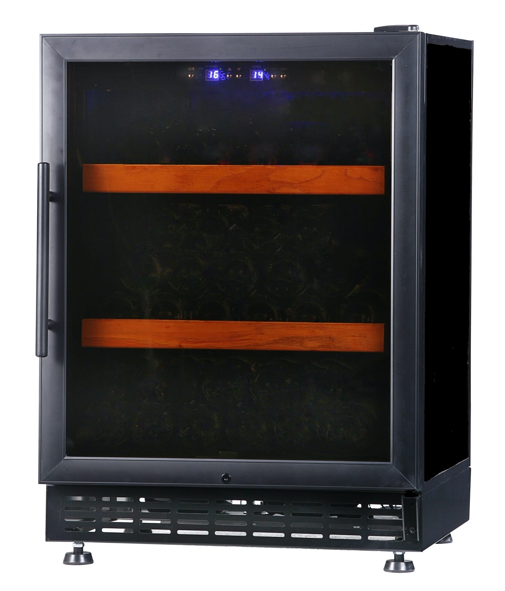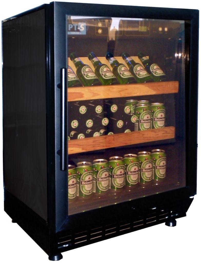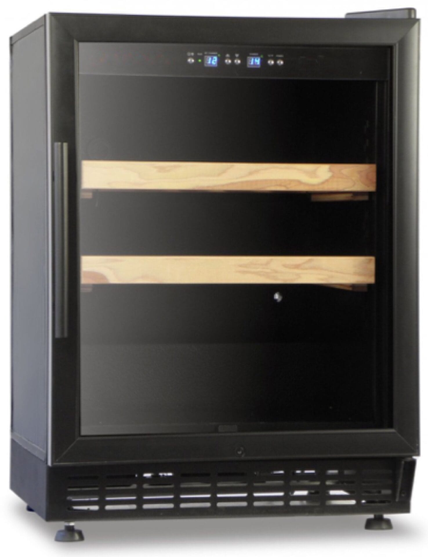 Ein schwarzer Bierklimaschrank mit Glastür, Holzregalen und einer digitalen Temperaturanzeige auf der Oberseite.