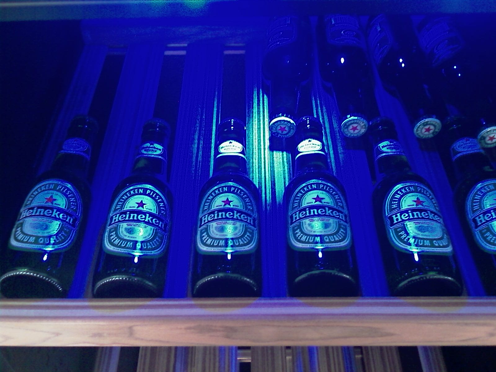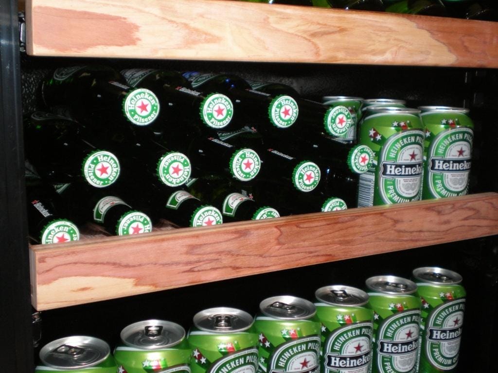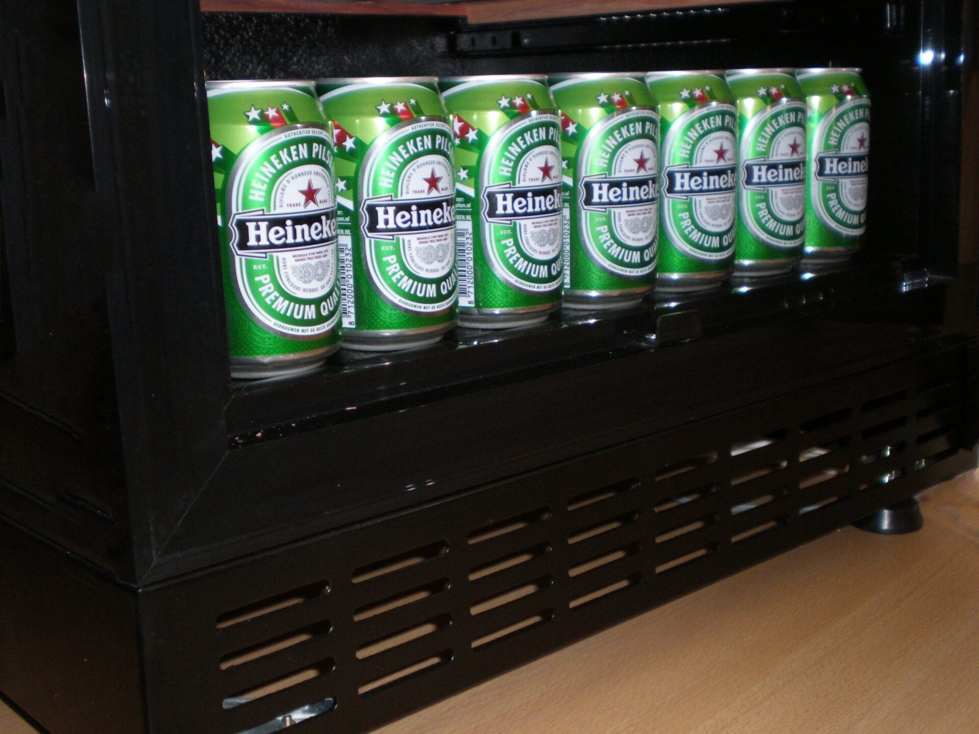Ein Bierlagerschrank (450 Liter, Höhe 180 cm) mit Reihen grüner Heineken-Bierflaschen und -Dosen auf Holzregalen, beleuchtet durch Innenbeleuchtung.