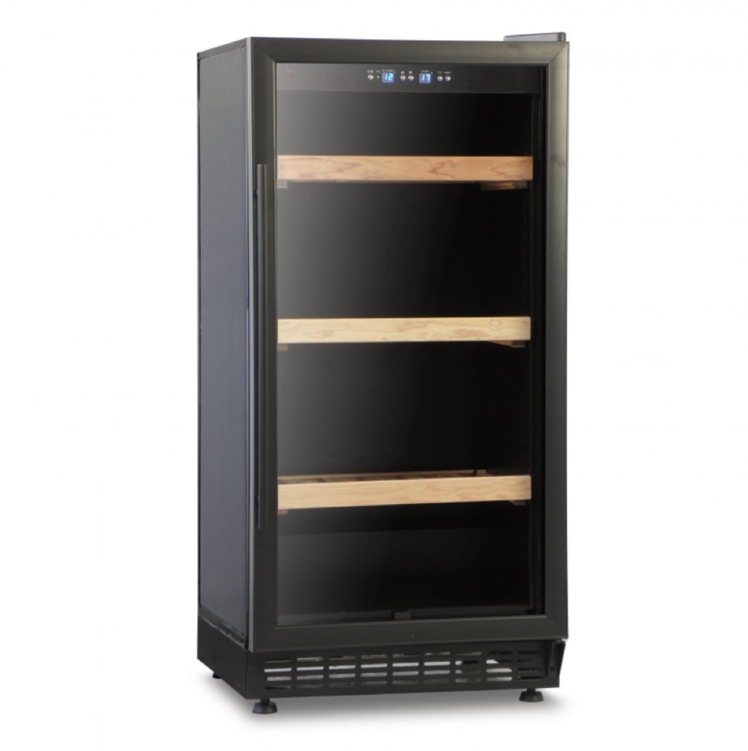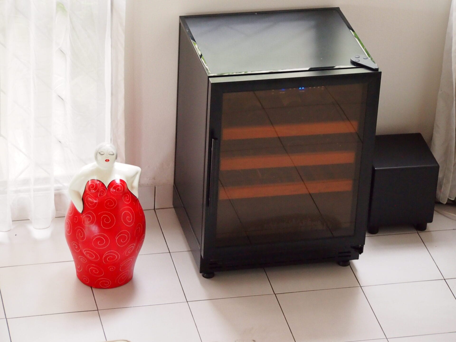 Een Champagne bewaarkast (1 zone, hoogte 84cm, 105 liter) op een witte tegelvloer in een kamer. De champagne bewaarkast kan gewoon stand-alone staan.