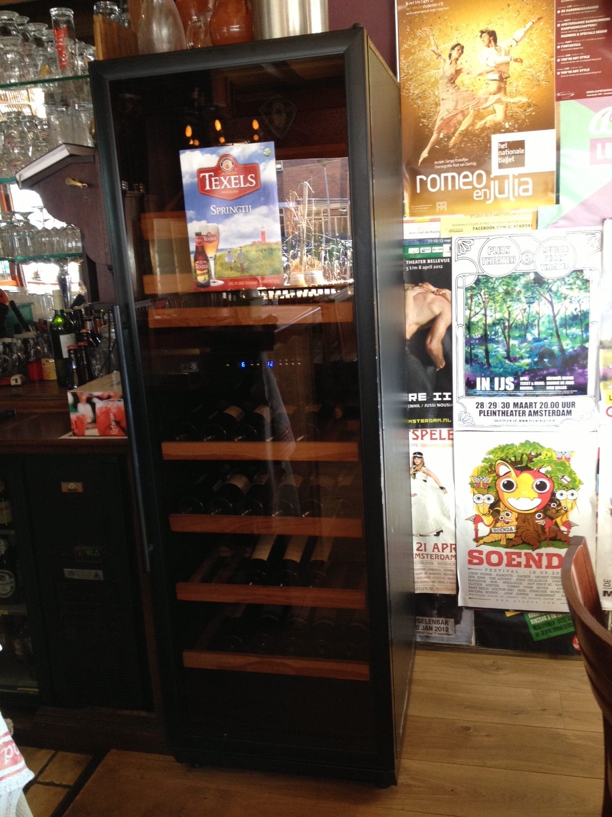 Een hoge klimaatkast met glazen deur (hoogte 180 cm) gevuld met flessen, staande naast posters en advertenties in een barsetting. Promotiefolder geplakt op de deur.