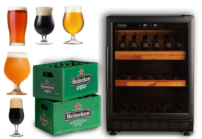 Verschiedene Biergläser mit verschiedenen Bieren, Heineken-Kisten und ein mit Flaschen gefüllter Bierklimaschrank.