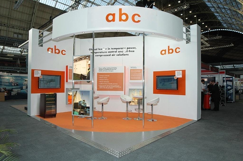 Messestand mit „abc“-Logo mit Displays, Informationstafeln und Sitzecke, in einer großzügigen Halle mit sichtbarer Deckenkonstruktion.
