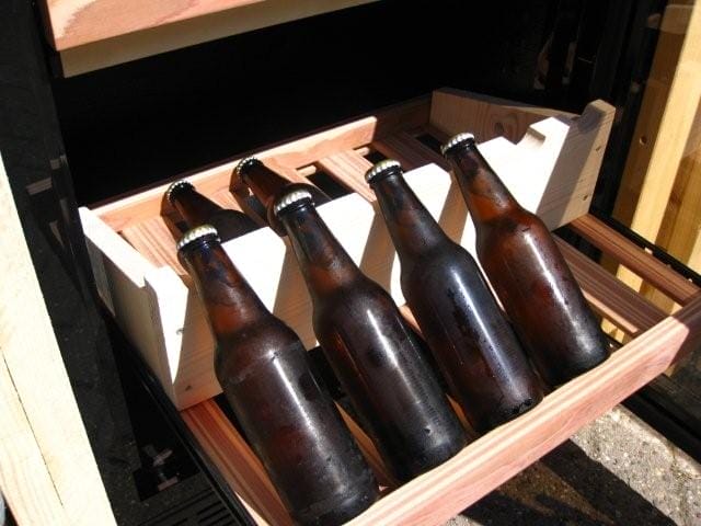 Verlichte bierkast gevuld met diverse flesjes bier op houten de houten plateaus.