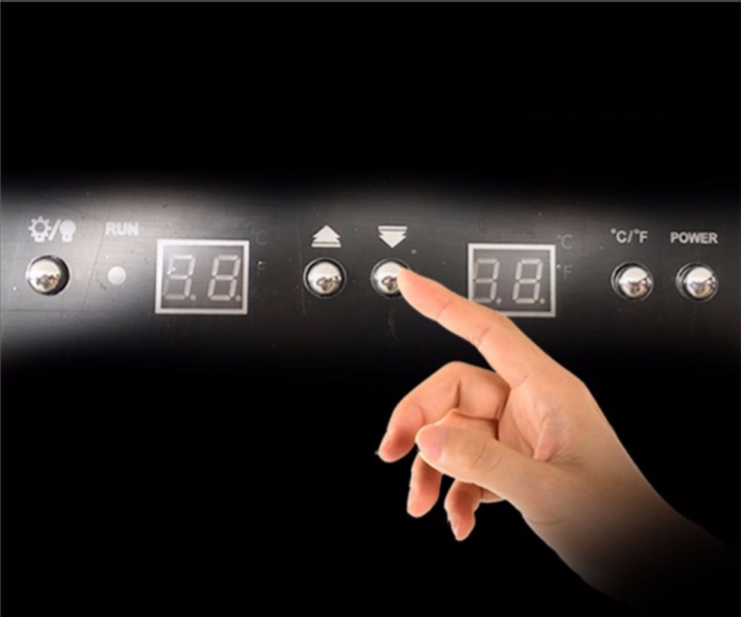 Ein schwarzes Lagerregal mit einer Glastür, das drei Holzböden und ein digitales Temperaturkontrollpaneel oben enthält.
