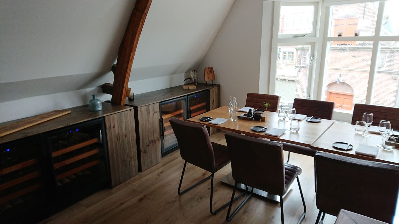 Esszimmer im Dachgeschoss mit Holztisch für sechs Personen, flankiert von einem Bierklimaschrank (105 Liter, Höhe 84 cm, Mehrzonen) und rustikalen Lagerschränken, große Fenster mit Blick auf die Stadtlandschaft.