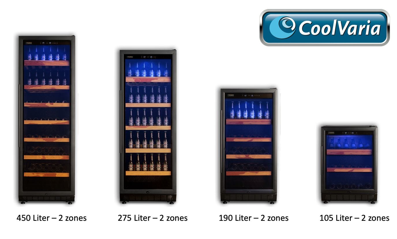Vier Modelle von Weinkühlschränken zur Bierlagerung von coolvaria, von 450 bis 105 Litern, jeweils mit zwei Temperaturzonen, abgebildet mit Weinflaschen im Inneren.