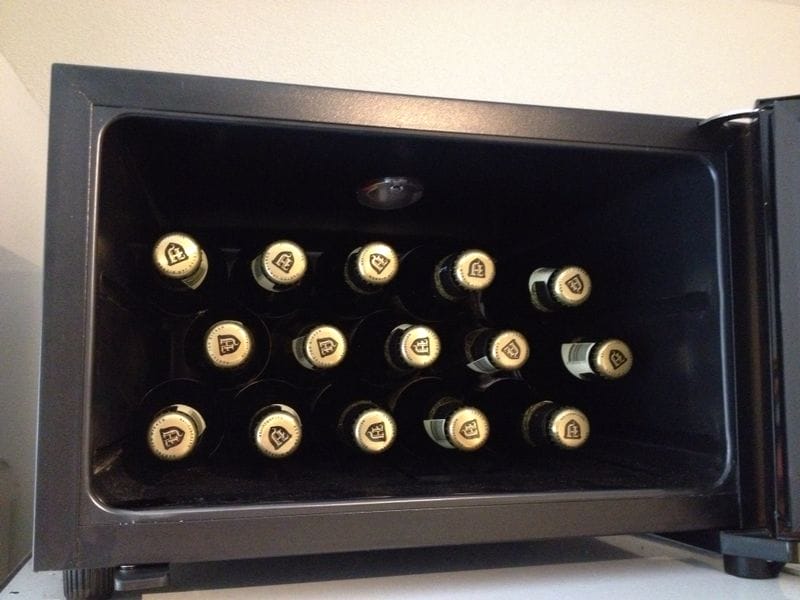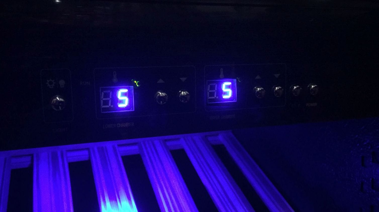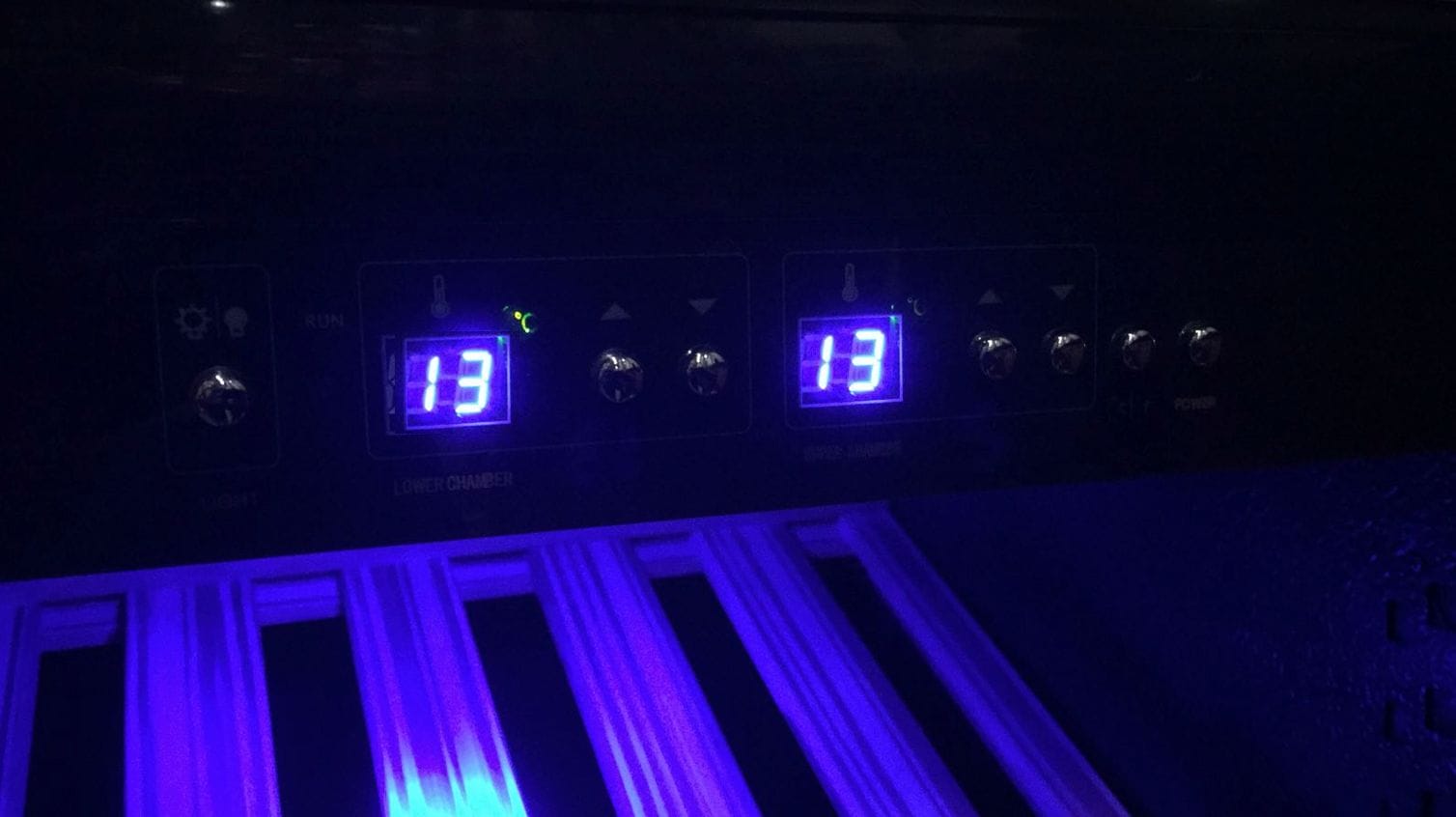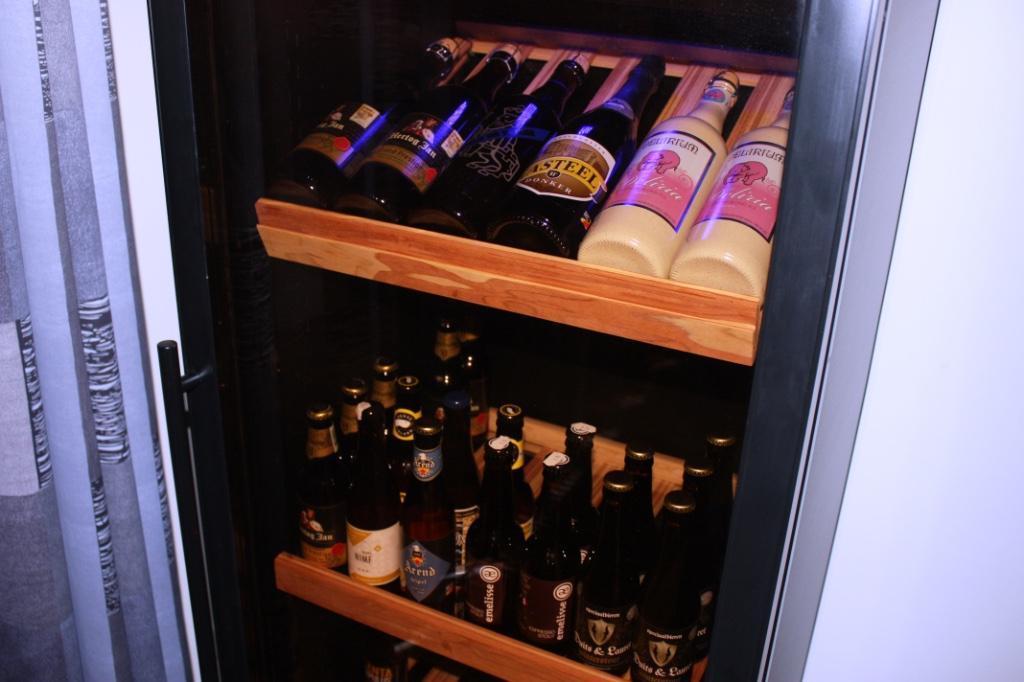 Een bierkast met verschillende flessen bier uitgestald op een houten plateau, verlicht door een blauw licht aan de binnenkant dat de digitale temperatuur weergeeft.