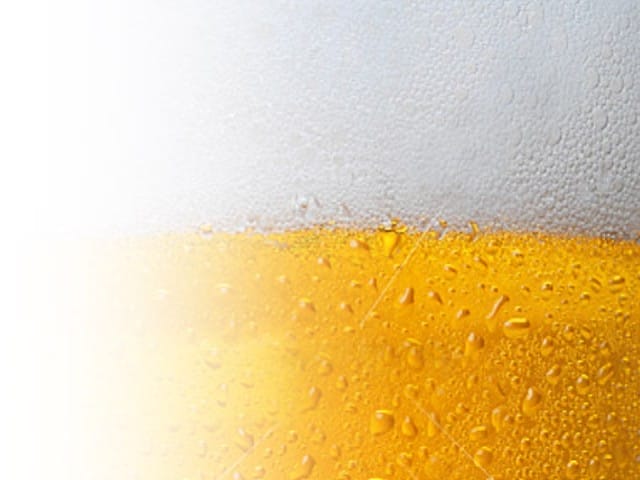 Nahaufnahme von Kondenswasser und Luftblasen an der Seite einer Bier-Klimakammer (450 Liter, Höhe 180 cm, mehrere Zonen), mit einem Farbverlauf von klar zu bernsteinfarben.