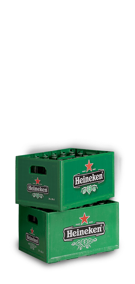 Zwei übereinander gestapelte grüne Heineken-Bierkisten vor schwarzem Hintergrund.