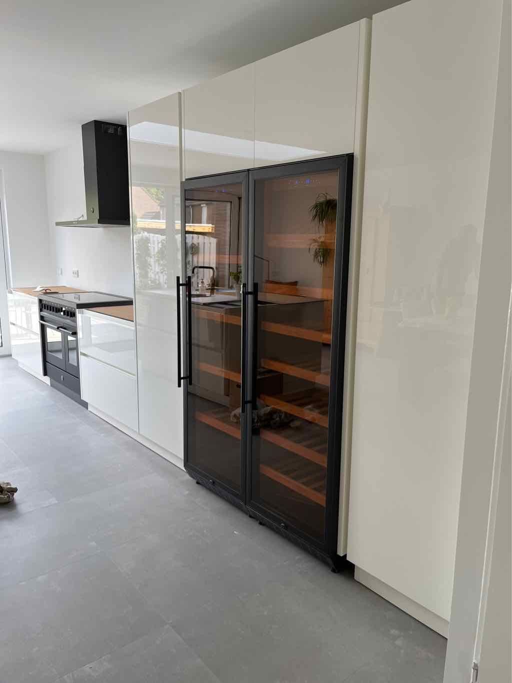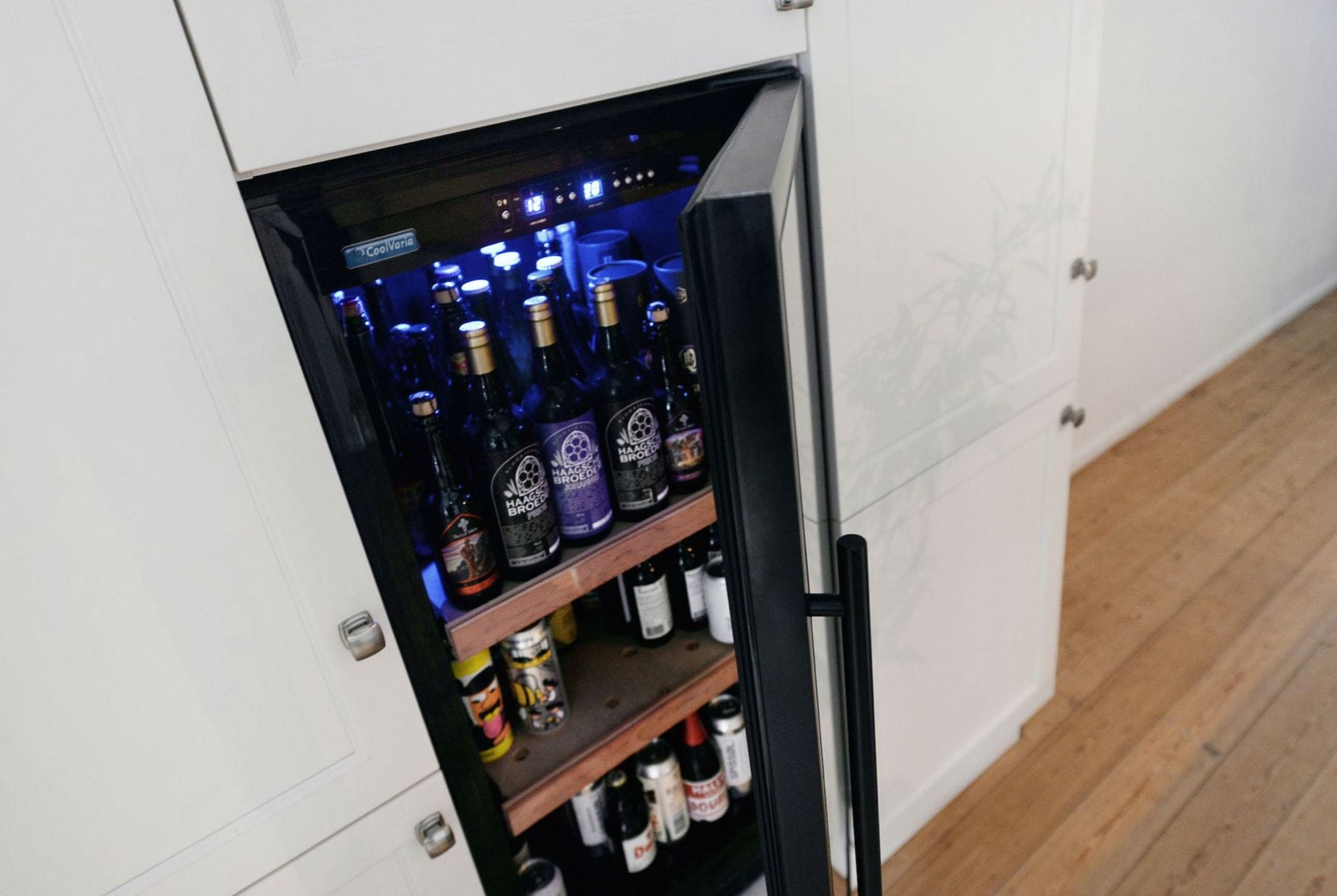 Ein moderner Küchenschrank mit Glastür, der verschiedene Töpfe und ein Weinregal enthält, sowie ein Bierklimaschrank (450 Liter, Höhe 180 cm, mehrere Zonen) auf einer Holzarbeitsplatte.