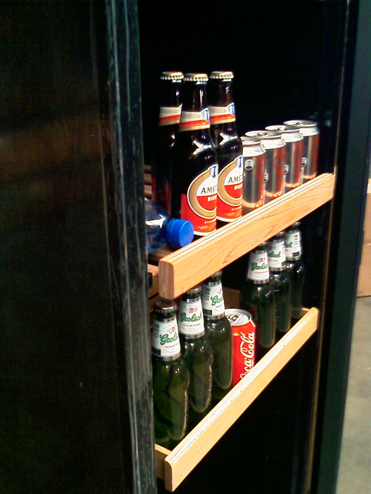 Holzregal zur Aufbewahrung einer Auswahl an Bierflaschen und -dosen im Lagerschrank (450 Liter, Höhe 180 cm).