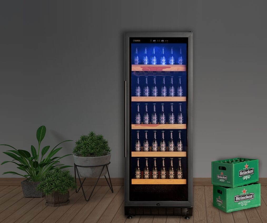 The total volume is 275 liters and you can store your cans, bottles and KEGs both horizontally and vertically.