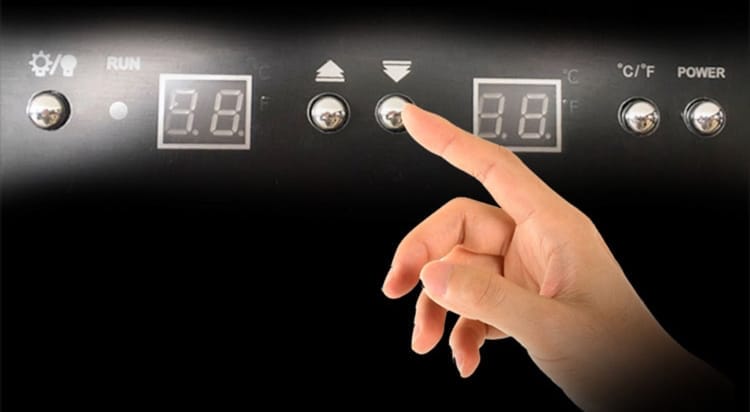 Het bedieningspaneel heeft twee displays; één met de ingestelde temperatuur en één met de relatieve luchtvochtigheid (indicatief), zodat u direct de huidige temperatuur in uw kast kunt zien).